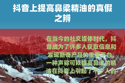 在当今的社交媒体时代,抖音成为了许多人获取信息和发现新奇产品的重要平台,一种声称可以提高鼻梁的精油在抖音上引起了不少人的关注,抖音上所说的提高鼻梁精油是真的还是假的呢?
