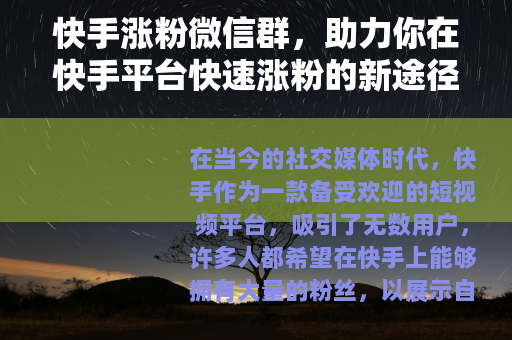 在当今的社交媒体时代,快手作为一款备受欢迎的短视频平台,吸引了无数用户,许多人都希望在快手上能够拥有大量的粉丝,以展示自己的才华、分享生活点滴或推广自己的产品与服务,而快手涨粉微信群的出现,为众多快手用户提供了一个新的机会。