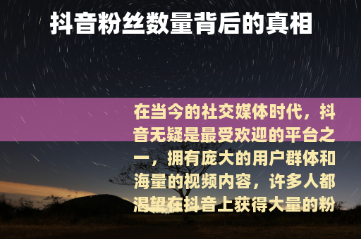 在当今的社交媒体时代,抖音无疑是最受欢迎的平台之一,拥有庞大的用户群体和海量的视频内容,许多人都渴望在抖音上获得大量的粉丝,以此来提升自己的影响力和知名度,关于抖音粉丝的一些现象却引发了人们的关注。