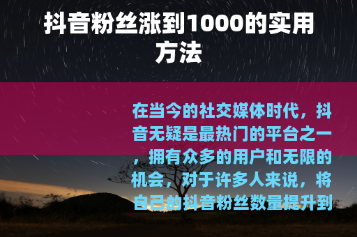 在当今的社交媒体时代,抖音无疑是最热门的平台之一,拥有众多的用户和无限的机会,对于许多人来说,将自己的抖音粉丝数量提升到1000是一个重要的目标,因为这不仅能增加账号的影响力,还能开启更多的功能和可能性,以下是一些可以帮助你在抖音上实现粉丝增长到1000的有效方法。