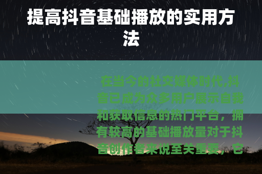 在当今的社交媒体时代,抖音已成为众多用户展示自我和获取信息的热门平台,拥有较高的基础播放量对于抖音创作者来说至关重要,它不仅能增加账号的曝光度,还可能带来更多的粉丝和商业机会,怎样提高抖音基础播放呢?以下是一些实用的方法。 质量是关键,确保你的视频内容具有独特性、趣味性和实用性,独特的内容能够吸引用户的注意力,让他们在众多视频中选择观看你的作品,趣味性则可以让用户在观看过程中感到愉悦,从而更愿意停留并与你的视频产生互动,而实用性强的内容,如知识分享、技能教学等,会让用户觉得观看你的视频能有所收获,进而提高他们对你账号的关注度。