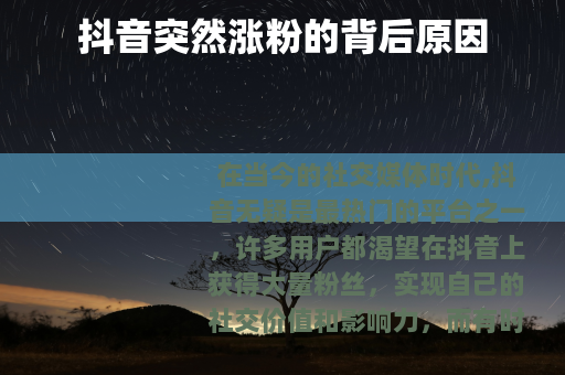 在当今的社交媒体时代,抖音无疑是最热门的平台之一,许多用户都渴望在抖音上获得大量粉丝,实现自己的社交价值和影响力,而有时候,我们会发现一些账号突然之间涨粉迅速,这背后究竟有着怎样的原因呢?