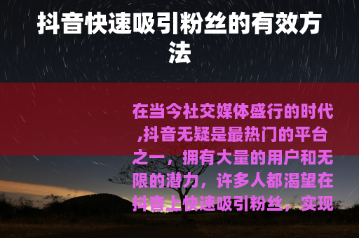 在当今社交媒体盛行的时代,抖音无疑是最热门的平台之一,拥有大量的用户和无限的潜力,许多人都渴望在抖音上快速吸引粉丝,实现自己的影响力和价值,以下是一些切实可行的方法,帮助你在抖音上快速积累粉丝。 是关键,你需要明确自己的定位和擅长的领域,例如美食、时尚、健身、搞笑等,然后围绕这个主题创作有价值、有趣且独特的视频内容,确保你的视频能够在众多的作品中脱颖而出,给用户带来新鲜感和惊喜,如果你擅长美食制作,那么可以分享一些独特的食谱、烹饪技巧或者美食背后的故事,让观众在欣赏美食的同时,还能学到知识,感受到乐趣。