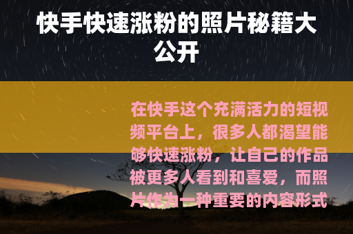 在快手这个充满活力的短视频平台上,很多人都渴望能够快速涨粉,让自己的作品被更多人看到和喜爱,而照片作为一种重要的内容形式,在快手上也有着巨大的潜力可以帮助我们实现涨粉的目标。