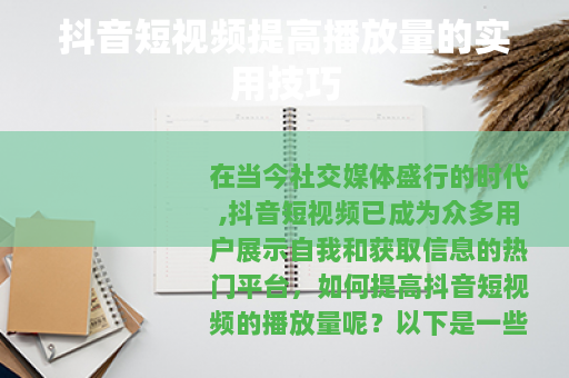 在当今社交媒体盛行的时代,抖音短视频已成为众多用户展示自我和获取信息的热门平台,如何提高抖音短视频的播放量呢?以下是一些实用的技巧。 质量是关键,要确保你的视频具有独特性和吸引力,可以从自身的兴趣、特长或当下热门话题中寻找灵感,制作出能引起观众共鸣的视频内容,如果你擅长烹饪,那么可以制作一系列精美的美食制作视频,详细展示每一个步骤和独特的烹饪技巧,让观众在观看的过程中不仅能学到知识,还能感受到美食的魅力。