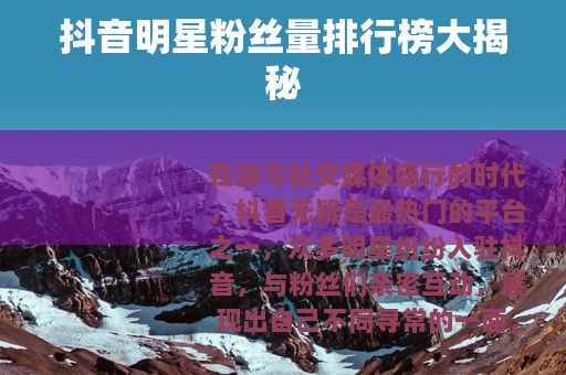 在当今社交媒体盛行的时代,抖音无疑是最热门的平台之一,众多明星纷纷入驻抖音,与粉丝们亲密互动,展现出自己不同寻常的一面,在众多抖音明星中,谁的粉丝最多呢?
