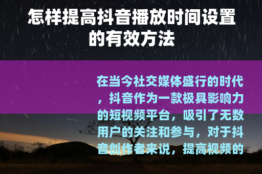 在当今社交媒体盛行的时代,抖音作为一款极具影响力的短视频平台,吸引了无数用户的关注和参与,对于抖音创作者来说,提高视频的播放时间设置是一个非常重要的目标,它能够增加视频的曝光度和用户粘性,以下是一些可以帮助你提高抖音播放时间设置的实用方法。