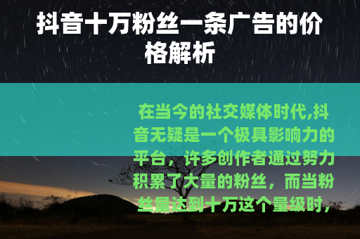 在当今的社交媒体时代,抖音无疑是一个极具影响力的平台,许多创作者通过努力积累了大量的粉丝,而当粉丝量达到十万这个量级时,广告商们往往会对其产生浓厚的兴趣,抖音十万粉丝一条广告究竟能值多少钱呢?