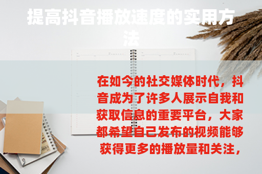 在如今的社交媒体时代,抖音成为了许多人展示自我和获取信息的重要平台,大家都希望自己发布的视频能够获得更多的播放量和关注,而视频的播放速度在一定程度上会影响用户的观看体验和传播效果,怎么样提高抖音播放速度呢?以下是一些实用的方法。 的质量至关重要,要确保视频具有清晰的画面和良好的音质,模糊不清或嘈杂的视频会让用户很快失去兴趣,从而影响播放速度,在拍摄前,要检查设备的摄像头和麦克风,确保它们处于最佳状态,拍摄过程中要注意光线的运用,避免过暗或过亮的场景,以保证画面的清晰度和色彩的鲜艳度。
