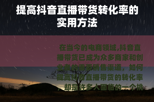 在当今的电商领域,抖音直播带货已成为众多商家和创业者的重要销售渠道,如何提高抖音直播带货的转化率,却是许多人面临的一个挑战,以下是一些可以帮助提高抖音直播带货转化率的有效方法。