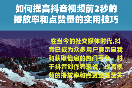 在当今的社交媒体时代,抖音已成为众多用户展示自我和获取信息的热门平台,对于抖音创作者来说,提高视频的播放率和点赞量是至关重要的,而视频的前2秒更是关键中的关键,如何提高抖音视频前2秒的播放率和点赞量呢?以下是一些实用的技巧。