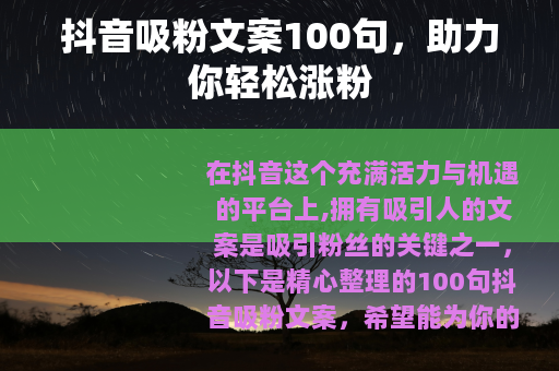 在抖音这个充满活力与机遇的平台上,拥有吸引人的文案是吸引粉丝的关键之一,以下是精心整理的100句抖音吸粉文案,希望能为你的抖音之旅增添助力。