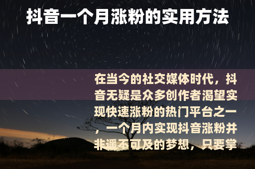 在当今的社交媒体时代,抖音无疑是众多创作者渴望实现快速涨粉的热门平台之一,一个月内实现抖音涨粉并非遥不可及的梦想,只要掌握了正确的方法和策略,你也可以在抖音上收获大量的粉丝。 的质量是关键,要确保你发布的视频具有独特性和吸引力,无论是搞笑、美食、美妆还是知识分享等各种领域,都要找到自己的特色和优势,为用户提供有价值的信息或带来欢乐和感动,如果你擅长烹饪,那么可以制作详细的美食制作教程,从食材的准备到烹饪的步骤,再到最后的成品展示,让观众能够跟着你的视频轻松学会一道美味佳肴,这样的实用内容往往能吸引大量的美食爱好者关注。