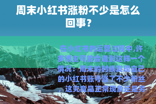 在小红书的运营过程中,许多博主可能会遇到这样一个情况:周末的时候发现自己的小红书账号涨了不少粉丝,这究竟是正常现象还是另有缘由呢?