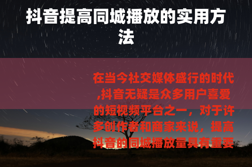 在当今社交媒体盛行的时代,抖音无疑是众多用户喜爱的短视频平台之一,对于许多创作者和商家来说,提高抖音的同城播放量具有重要意义,它可以让更多本地的用户看到自己的作品,从而增加粉丝量、提高知名度以及促进商业转化,抖音怎么提高同城播放呢?以下是一些实用的方法。