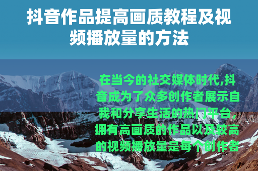 在当今的社交媒体时代,抖音成为了众多创作者展示自我和分享生活的热门平台,拥有高画质的作品以及较高的视频播放量是每个创作者都追求的目标,如何提高抖音作品的画质并增加视频播放量呢?以下是一些实用的方法。