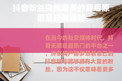 在当今的社交媒体时代,抖音无疑是最热门的平台之一,许多用户都梦想着自己的抖音账号能够拥有大量的粉丝,因为这不仅意味着更多的关注和认可,还可能带来各种商业机会和收益,当抖音账号突然粉丝多了起来,这背后可能有着多种不同的情况,需要我们认真去分析和对待。