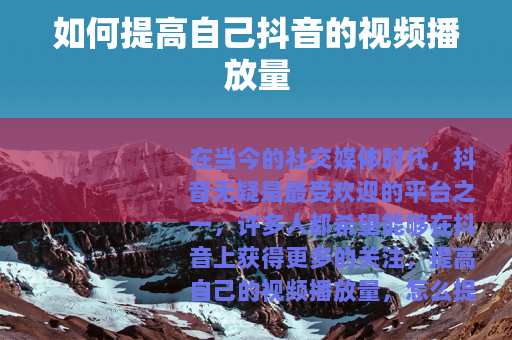 在当今的社交媒体时代,抖音无疑是最受欢迎的平台之一,许多人都希望能够在抖音上获得更多的关注,提高自己的视频播放量,怎么提高自己抖音的播放量呢?以下是一些实用的方法。 是关键,要确保你的视频内容具有吸引力和独特性,可以从自己的兴趣爱好、专业技能或者当下热门的话题入手,制作出能够引起观众共鸣的视频,如果你擅长烹饪,那么可以制作一系列精美的美食制作视频,分享独特的食谱和烹饪技巧,或者,如果你对时尚有敏锐的洞察力,那么可以通过展示不同的穿搭风格,为观众提供时尚灵感,只有当你的内容能够真正满足观众的需求,给他们带来价值,他们才会愿意观看你的视频,并且分享给更多的人。