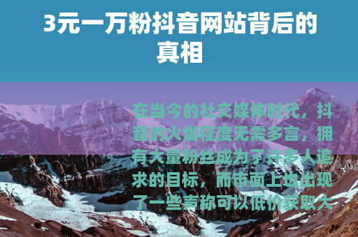 在当今的社交媒体时代,抖音的火爆程度无需多言,拥有大量粉丝成为了许多人追求的目标,而市面上也出现了一些声称可以低价获取大量粉丝的网站,其中就有3元一万粉的抖音网站,这看似诱人的背后,实则隐藏着诸多不为人知的秘密。