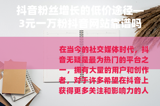 在当今的社交媒体时代,抖音无疑是最为热门的平台之一,拥有大量的用户和创作者,对于许多希望在抖音上获得更多关注和影响力的人来说,粉丝数量的增长是一个关键目标,而市场上也出现了一些声称可以以极低价格提供大量粉丝的网站,其中就有所谓的“3元一万粉抖音网站”。