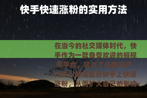 在当今的社交媒体时代,快手作为一款备受欢迎的短视频平台,吸引了无数用户,许多人都渴望在快手上快速涨粉,从而扩大自己的影响力和社交圈,以下是一些快手快速涨粉的有效方法。