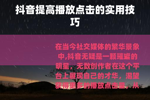 在当今社交媒体的繁华景象中,抖音无疑是一颗璀璨的明星,无数创作者在这个平台上展现自己的才华,渴望获得更多的播放点击量,从而实现自己的价值和目标,抖音如何提高播放点击呢?以下是一些经过实践检验的实用技巧。