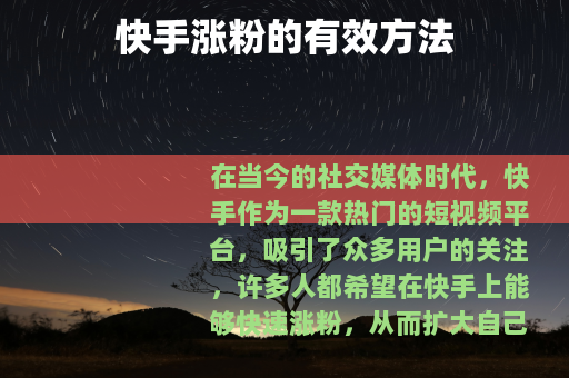 在当今的社交媒体时代,快手作为一款热门的短视频平台,吸引了众多用户的关注,许多人都希望在快手上能够快速涨粉,从而扩大自己的影响力和获得更多的机会,以下是一些快手涨粉的有效方法。