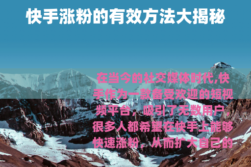 在当今的社交媒体时代,快手作为一款备受欢迎的短视频平台,吸引了无数用户,很多人都希望在快手上能够快速涨粉,从而扩大自己的影响力和实现各种目标,以下是一些快手涨粉的实用方法。
