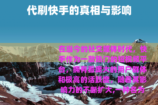 在当今的社交媒体时代,快手作为一款热门的短视频平台,拥有着庞大的用户群体和极高的活跃度,随着其影响力的不断扩大,一种名为代刷快手的现象也逐渐浮出水面。