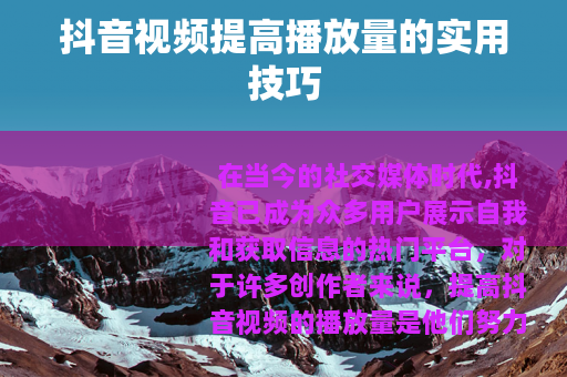 在当今的社交媒体时代,抖音已成为众多用户展示自我和获取信息的热门平台,对于许多创作者来说,提高抖音视频的播放量是他们努力追求的目标,究竟该如何提高抖音视频的播放量呢?以下是一些实用的技巧。 是关键,要确保你的视频内容具有吸引力和独特性,了解你的目标受众,制作他们感兴趣的内容,如果你面向的是年轻人群体,可以制作一些时尚、潮流、娱乐或搞笑的视频,要保持内容的新鲜感,避免重复和单调,这样才能让观众持续关注你的账号。