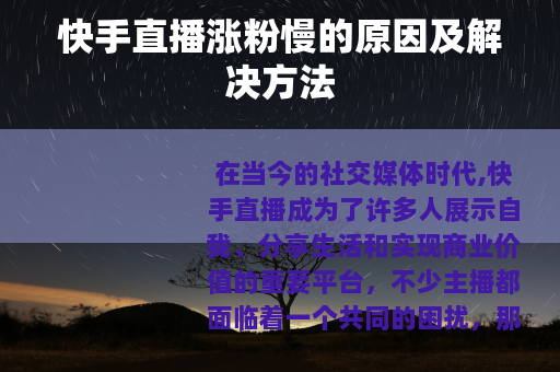 在当今的社交媒体时代,快手直播成为了许多人展示自我、分享生活和实现商业价值的重要平台,不少主播都面临着一个共同的困扰,那就是快手直播涨粉太慢了,这一问题不仅影响了主播们的积极性,也在一定程度上限制了他们在平台上的发展,究竟是什么原因导致快手直播涨粉缓慢呢? 质量是关键因素之一,如果直播内容缺乏吸引力、创新性和实用性,观众很可能在进入直播间后不久就会离开,更不用说关注主播了,一些主播的直播内容过于单调,只是简单地聊天或展示商品,没有给观众带来足够的价值和乐趣,相反,那些能够提供有趣的故事、专业的知识讲解或独特的才艺表演的主播,往往更容易吸引观众的关注并获得粉丝。