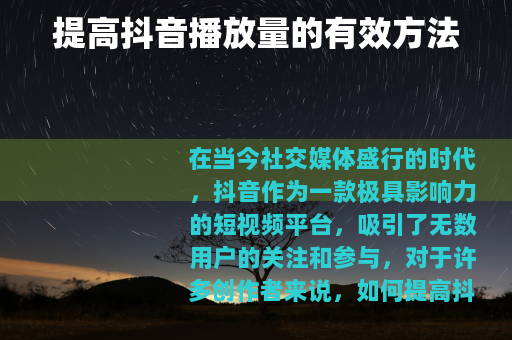 通过以上这些方法的综合运用,相信你能够有效地提高抖音播放量,在抖音平台上获得更多的关注和认可,实现自己的创作目标,不断学习和实践,根据用户的反馈和数据分析及时调整策略,你的抖音账号一定会越来越受欢迎,播放量也会不断攀升。