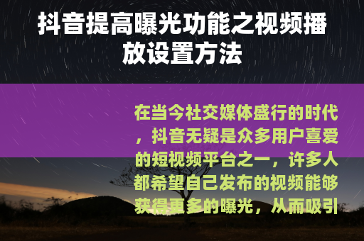 在当今社交媒体盛行的时代,抖音无疑是众多用户喜爱的短视频平台之一,许多人都希望自己发布的视频能够获得更多的曝光,从而吸引更多的关注和粉丝,抖音提高曝光功能中的视频播放设置是怎样的呢?