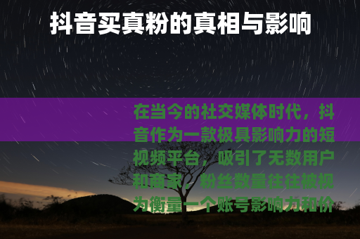 在当今的社交媒体时代,抖音作为一款极具影响力的短视频平台,吸引了无数用户和商家,粉丝数量往往被视为衡量一个账号影响力和价值的重要指标之一,一些人便将目光投向了购买抖音真粉这一途径,希望借此快速提升自己账号的人气。