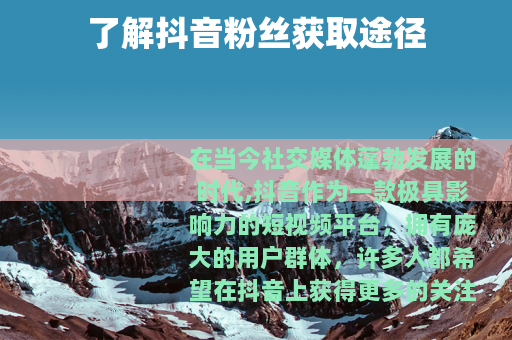 在当今社交媒体蓬勃发展的时代,抖音作为一款极具影响力的短视频平台,拥有庞大的用户群体,许多人都希望在抖音上获得更多的关注和粉丝,从而扩大自己的影响力,哪里能买抖音粉丝呢?