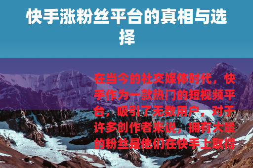 在当今的社交媒体时代,快手作为一款热门的短视频平台,吸引了无数用户,对于许多创作者来说,拥有大量的粉丝是他们在快手上取得成功的关键之一,快手涨粉丝平台也应运而生。