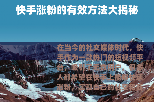 在当今的社交媒体时代,快手作为一款热门的短视频平台,吸引了无数用户,很多人都希望在快手上能够快速涨粉,实现自己的社交和商业价值,快手涨粉到底有没有方法呢?答案是肯定的。 质量是关键,要制作出高质量、有吸引力的视频内容,这意味着视频要有清晰的画面、良好的音质,以及独特的创意和价值,可以分享自己的才艺,如唱歌、跳舞、绘画等;也可以制作有趣的生活小妙招、美食制作教程等实用性强的内容,只有当用户觉得你的视频有趣、有用,他们才会愿意关注你,成为你的粉丝。