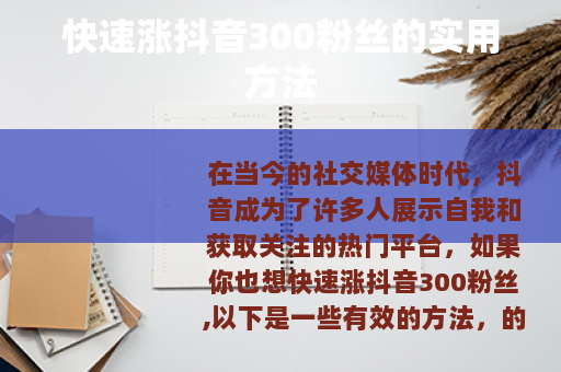 在当今的社交媒体时代,抖音成为了许多人展示自我和获取关注的热门平台,如果你也想快速涨抖音300粉丝,以下是一些有效的方法。
