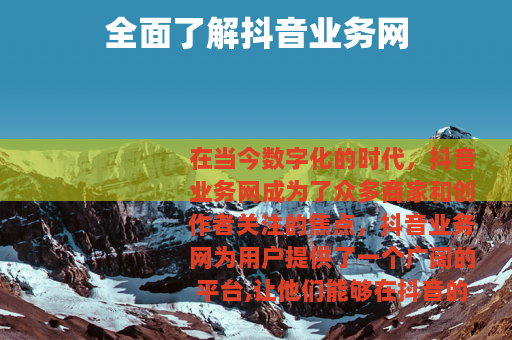 在当今数字化的时代,抖音业务网成为了众多商家和创作者关注的焦点,抖音业务网为用户提供了一个广阔的平台,让他们能够在抖音的生态系统中开展各种业务活动。