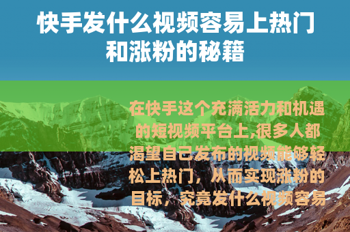 在快手这个充满活力和机遇的短视频平台上,很多人都渴望自己发布的视频能够轻松上热门,从而实现涨粉的目标,究竟发什么视频容易在快手上达到这样的效果呢?