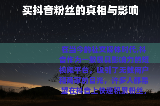在当今的社交媒体时代,抖音作为一款极具影响力的短视频平台,吸引了无数用户和商家的目光,许多人都希望在抖音上快速积累粉丝,从而提升自己的影响力和商业价值,在这种需求下,买抖音粉丝的现象逐渐兴起。