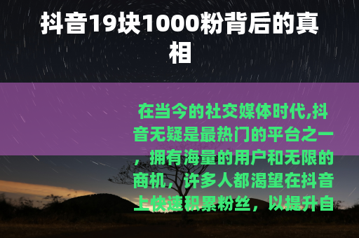 在当今的社交媒体时代,抖音无疑是最热门的平台之一,拥有海量的用户和无限的商机,许多人都渴望在抖音上快速积累粉丝,以提升自己的影响力和商业价值,而市场上出现了一种声称只需19块就能获得1000粉的服务,这看似极具吸引力的背后,实则有着诸多值得我们深入探讨的方面。