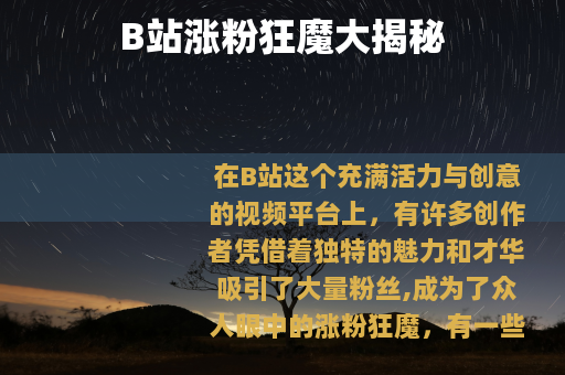 在B站这个充满活力与创意的视频平台上,有许多创作者凭借着独特的魅力和才华吸引了大量粉丝,成为了众人眼中的涨粉狂魔。