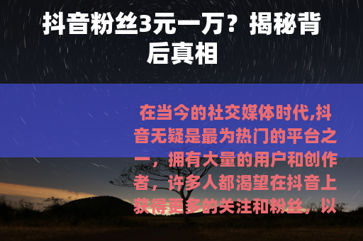 市场上出现了一种声称抖音粉丝3元一万的现象,这看似是一个极具吸引力的捷径,让不少人蠢蠢欲动,但我们需要深入了解其背后的真实情况。
