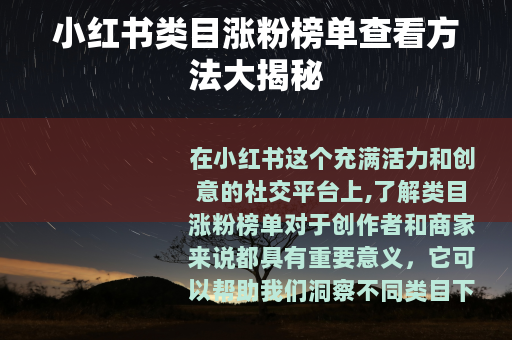 在小红书这个充满活力和创意的社交平台上,了解类目涨粉榜单对于创作者和商家来说都具有重要意义,它可以帮助我们洞察不同类目下的热门趋势,从而更好地制定自己的内容策略和发展方向,小红书怎么看类目涨粉榜单呢?