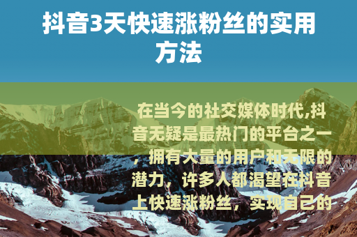 通过以上这些方法的综合运用,你就有很大的机会在抖音上实现3天涨粉丝的目标,开启自己的抖音成功之旅,在这个充满机遇的平台上展现自己的风采,收获更多的关注和喜爱。
