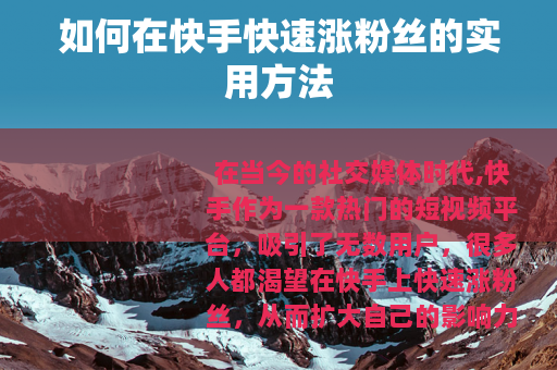 在当今的社交媒体时代,快手作为一款热门的短视频平台,吸引了无数用户,很多人都渴望在快手上快速涨粉丝,从而扩大自己的影响力,那么究竟如何才能实现这一目标呢?以下是一些实用的方法。