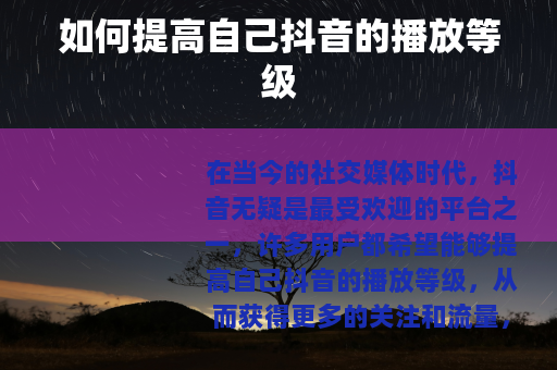 在当今的社交媒体时代,抖音无疑是最受欢迎的平台之一,许多用户都希望能够提高自己抖音的播放等级,从而获得更多的关注和流量,究竟该怎么做呢? 质量是关键,要确保你的视频具有独特性和吸引力,可以从自己的兴趣爱好、专业技能或生活中的有趣经历出发,制作出能够引起观众共鸣的视频,如果你擅长烹饪,那么可以分享一些独特的食谱或烹饪技巧;如果你喜欢旅行,就可以记录下旅途中的美景和有趣的故事。