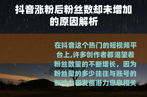 在抖音这个热门的短视频平台上,许多创作者都渴望着粉丝数量的不断增长,因为粉丝量的多少往往与账号的影响力和发展潜力息息相关,有时候会出现一种令人困惑的情况,那就是明明感觉自己的账号涨粉丝了,可实际查看粉丝数却并没有增加,这究竟是怎么回事呢?