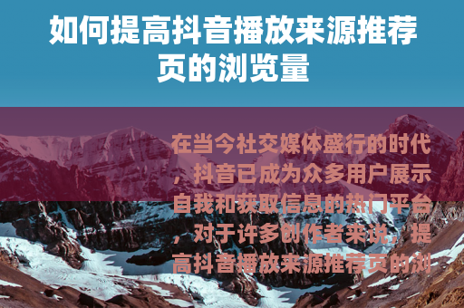 在当今社交媒体盛行的时代,抖音已成为众多用户展示自我和获取信息的热门平台,对于许多创作者来说,提高抖音播放来源推荐页的浏览量是他们努力追求的目标,以下是一些有效的方法,可以帮助你实现这一目标。 质量是关键,确保你的视频内容具有吸引力、独特性和价值,观众更愿意观看那些能够引起他们兴趣、让他们感到愉悦或能从中获取到有用知识的视频,你可以分享有趣的生活故事、实用的生活小妙招、精彩的才艺表演等,在制作视频时,要注重画面的清晰度和稳定性,以及声音的清晰度,为观众提供良好的观看体验。